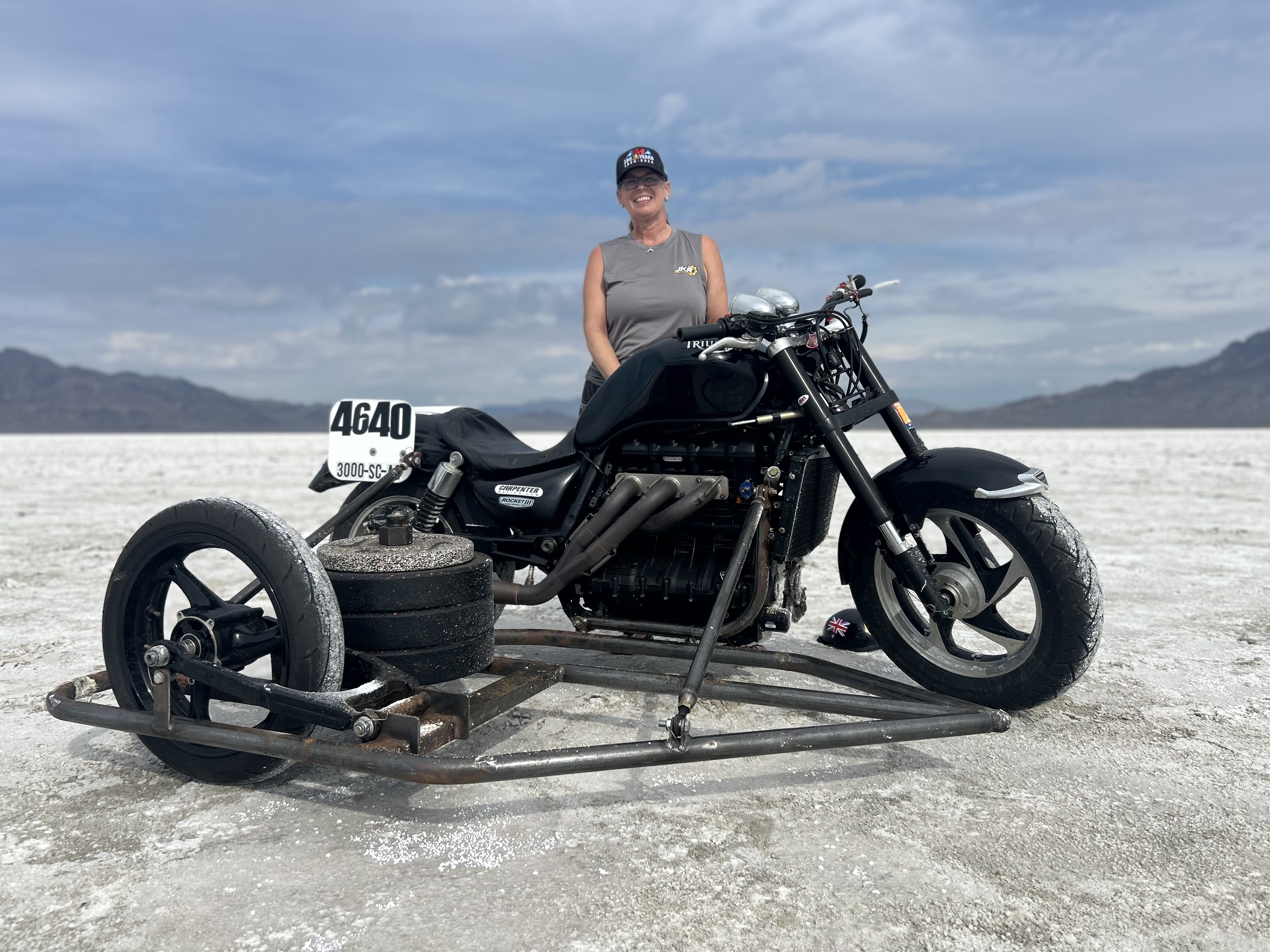 Riders are measured over both a timed mile and a timed kilometre and after their initial down run they have two hours to complete a return run with the times combined and an average calculated to determine the official speed and Langlois piloted her unfaired, three-cylinder 2012 JKR Powersports 2295cc Triumph Rocket 111 Roadster with weighted sidecar to an FIM World Record of 136.331mph (219.404km/h) over the timed kilometre.